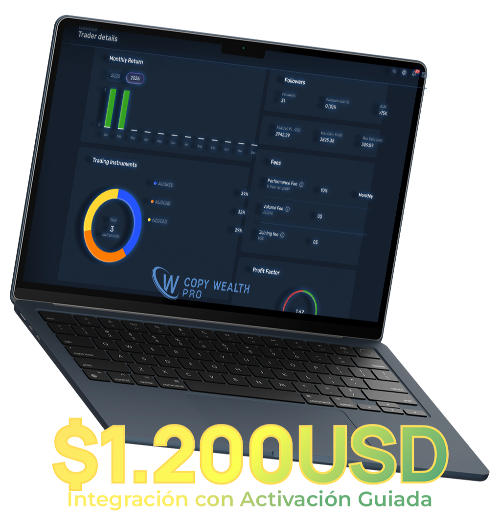 Es una herramienta profesional de copy trading institucional que conecta tu cuenta a estrategias automatizadas diseñadas con criterios técnicos, gestión de riesgo estructurada y supervisión profesional.