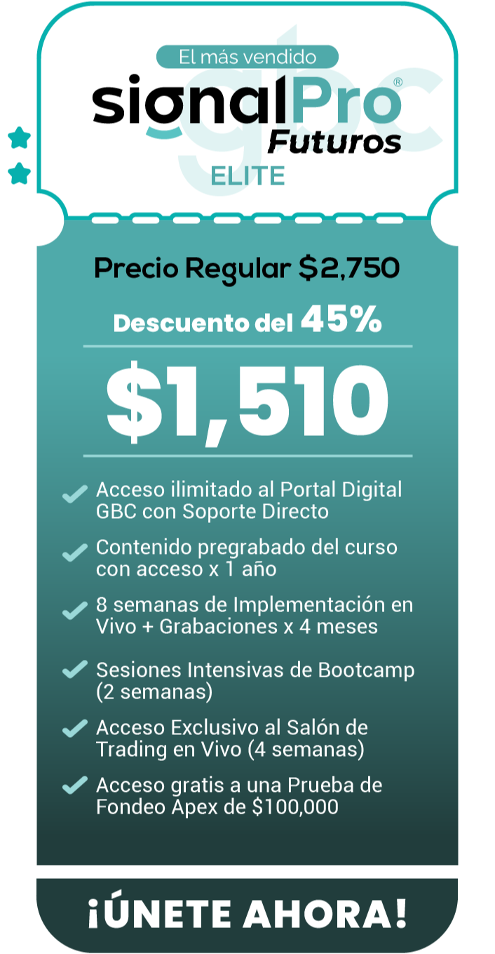 Como parte de Signal Pro – Futuros, tienes la posibilidad de participar en el Bootcamp y el Salón de Trading en Vivo, dos espacios diseñados para llevar la formación a la práctica real. Aquí ejecutas, ajustas y fortaleces tu proceso operativo junto a los mejores Signalist Expertos de GBC, en un entorno controlado y profesional, disponibles como extensión opcional del programa.