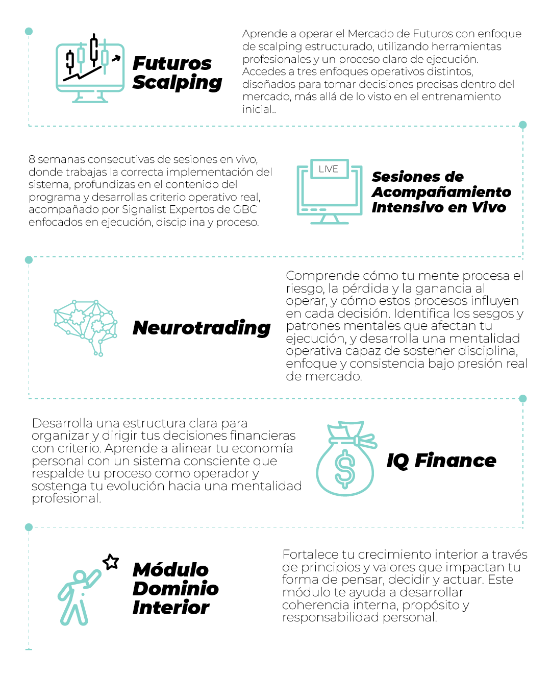 Durante 8 semanas, participas en 16 sesiones en vivo junto a Signalist Expertos de GBC, donde: