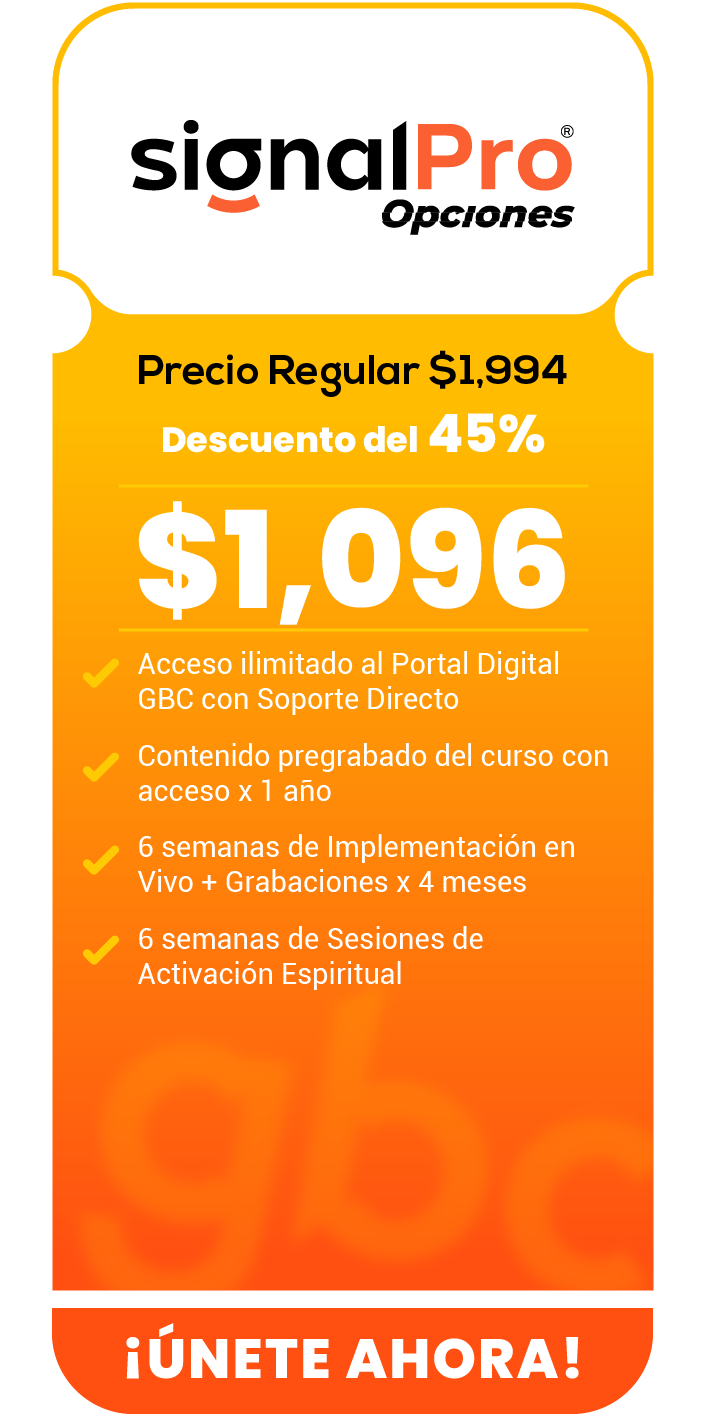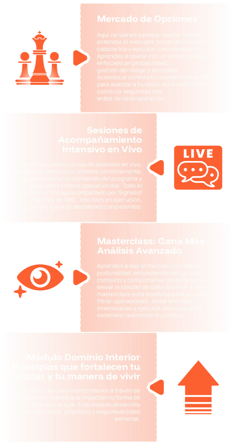 Signal Pro Opciones es la formación donde dejas de operar por intuición y comienzas a tomar decisiones con estructura, lógica y control para producir resultados reales en el Mercado de Opciones.